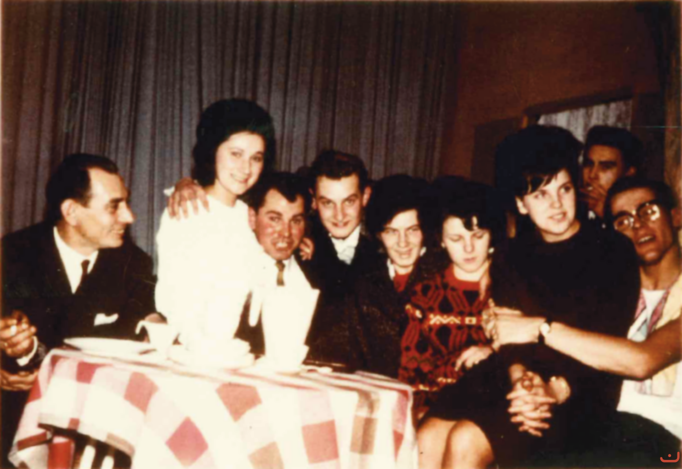 (v.l.n.r.) Johann Beyer (Regiesseur), Christl Michl (Frau Kern), Josef Klinger (Herr Kern), Georg Strobel (Sohn von Kirsch), Rosa Rößle (verh. Klinger, Frau Kern), Annemarie Seifried (Tochter von Kern), Christl Grumm (Frau Kirsch), Herbert Hurler (im Hintergrund, Soufleur), Franz Kimmerle (Herr Kirsch); auf dem Bild fehlt Reiner Rupp (Herr Zweigle; wahrscheinlich hat er das Foto gemacht)